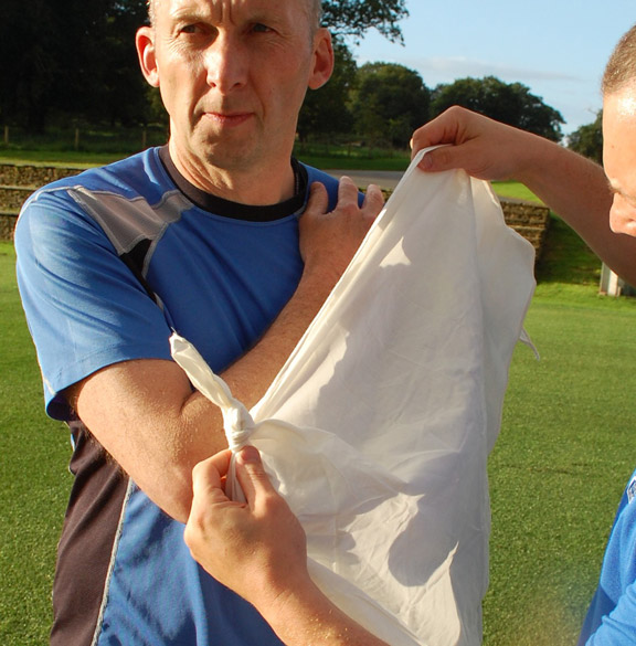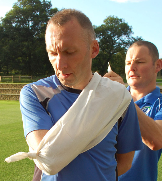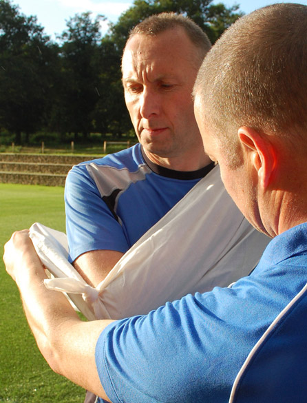 三角巾を用いて挙上する、もう一つの簡単な吊包帯です。手や手首のケガに適しています。