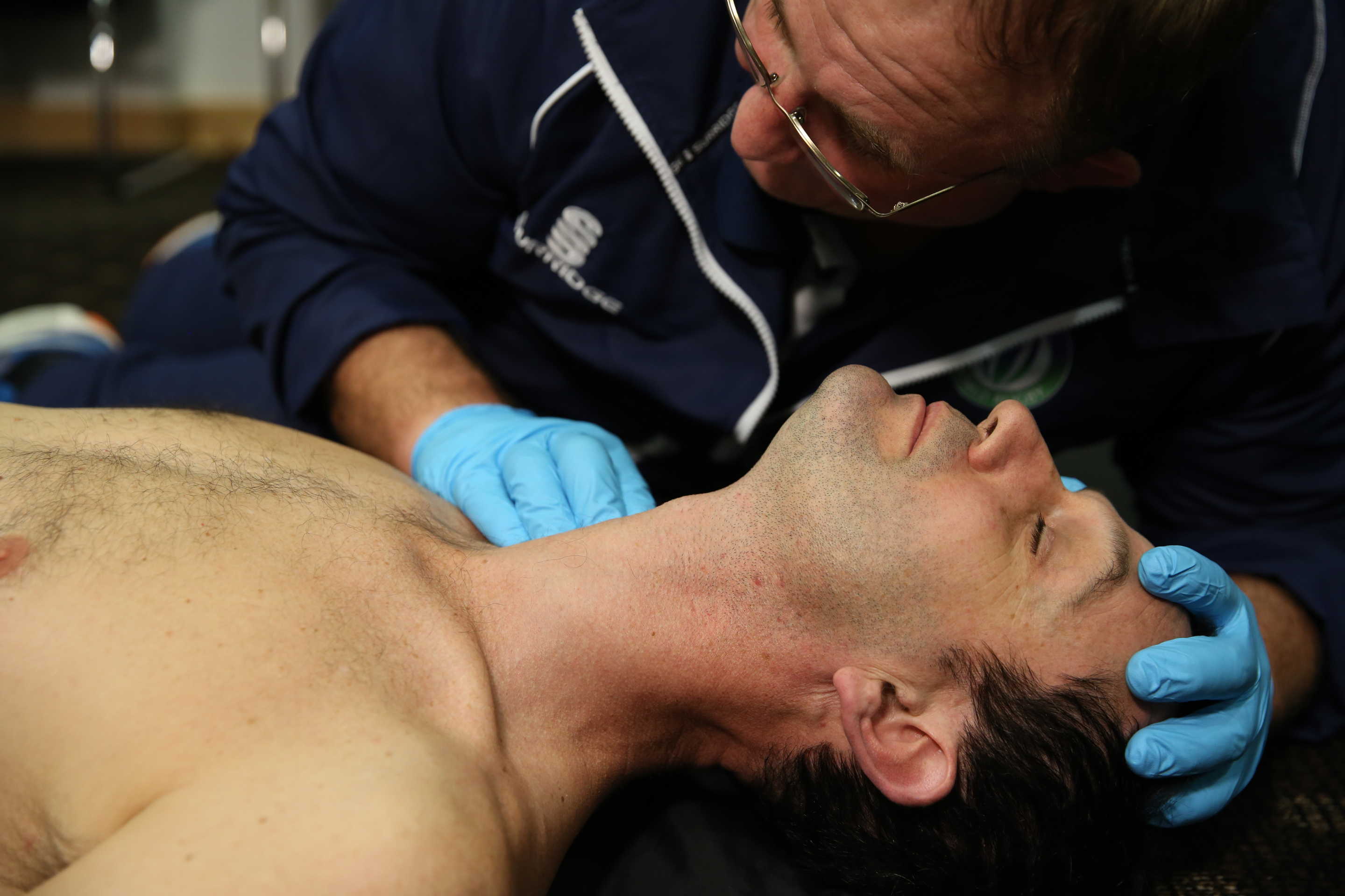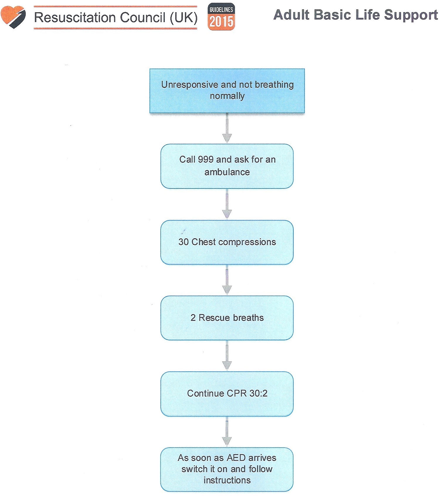 上記のアルゴリズムは、心停止したプレーヤーの評価とCPRの実施における重要な手順を示しています。特に、プレーヤーが呼吸していないことに気付いたら、早く救助を求めること、必ず救助が現場に向かっていること、救急車を要請することが最優先事項となります。                                                                               非外傷的な理由で倒れた場合、呼吸の評価は頭部を後に傾けて下顎を上げて(頭部後屈下顎挙上法)見て、聞いて、触れて、10秒間観察します。