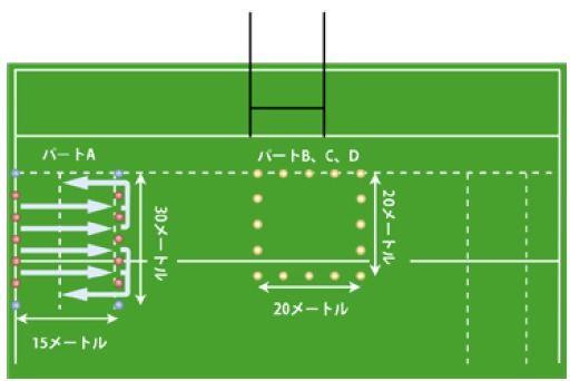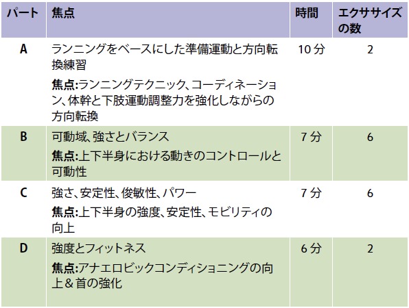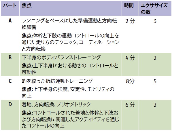 このプログラムはランニングベースのウォーミングアップから始ま り、下肢のバランス、強度、パワー、モビリティ、そして着地時及び 方向転換時のコントロール能力の育成と訓練を行うためのエクササイ ズが続きます。このプログラムは、天然芝、または人工芝のゆったり とした広さがあるピッチで行うのがベストですが、床が滑らない屋内 (例えば体育館)でも行うことが可能です。コーチは、プログラムを 行う空間に危険が潜んでいないか確認しておくことが必要です。