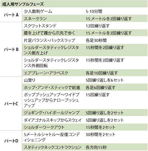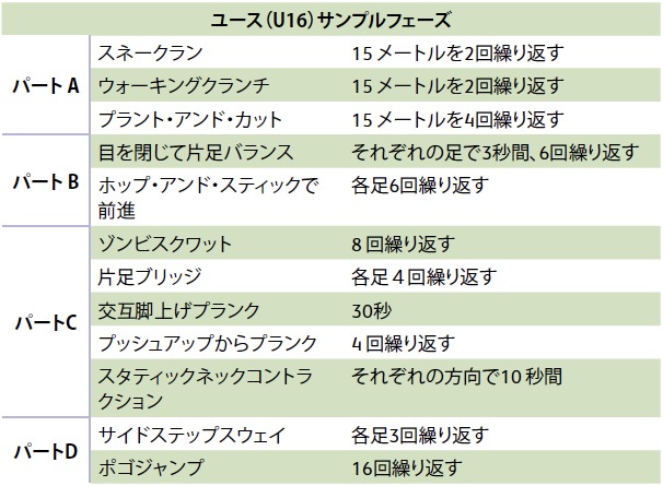 ユースと成人用プログラムいずれにもトレーニング法のタイプとして次のものが含まれます:ランニング及び方向ベースのアクティビティ、下肢 バランストレーニング、プリオメトリックと着地アクティビティ、自重&パートナーレジスタンストレーニング。ユース(16歳未満)用及び成 人用アクティブプログラムのサンプルフェーズは次の通りです。