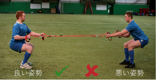 背中をまっすぐにしたまま、できるだけ低くスクワットする。ゆっくりと、コントロールしながらスクワットする。まっすぐ前を見ていること。かかとは、最後まで地面から離さない。頭の上でボールを持って行ってもよい。