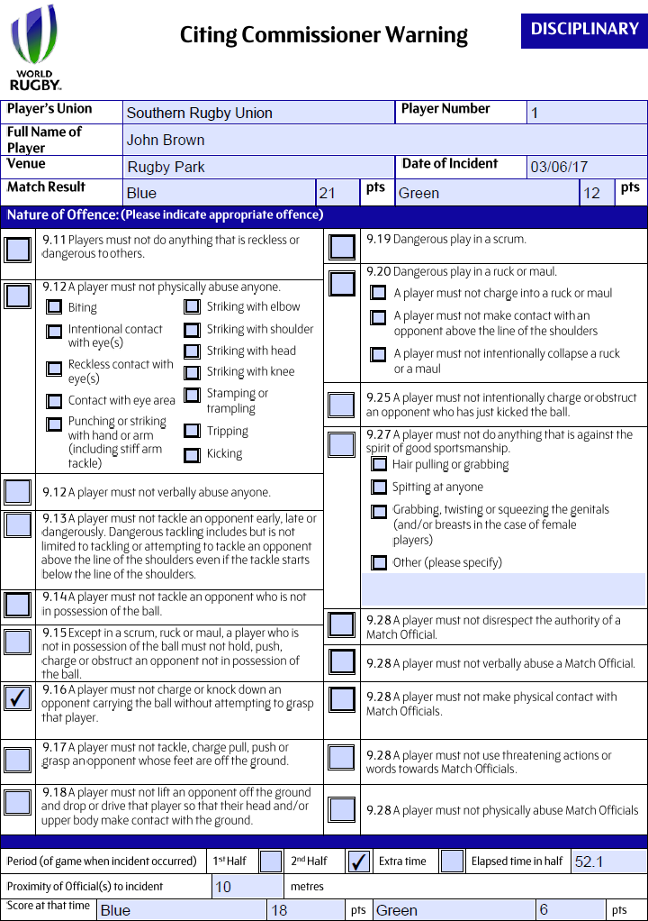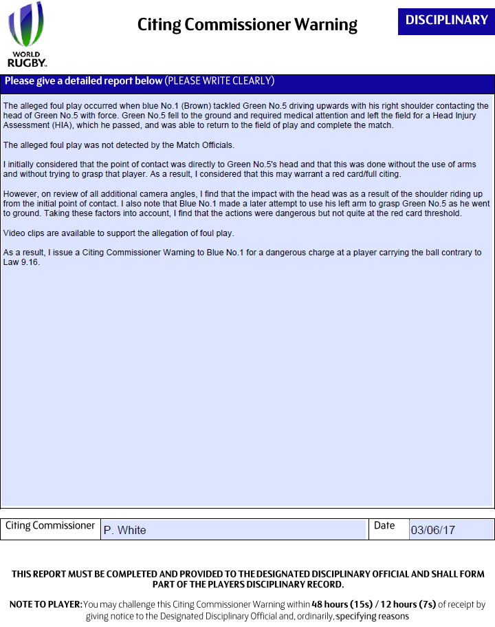 Set out what your conclusions are regarding the alleged act of foul play I find that the action of Blue No.1, whilst dangerous play, was close to, but not quite at, the Red Card threshold as contact was initially at chest height with the impact causing the shoulder to ride up towards the victim player’s head. There was also an attempt to grasp the tackled player as he went to ground. As a result of my analysis I believe that a Citing Commissioner Warning is appropriate and should be issued to Blue No.1.