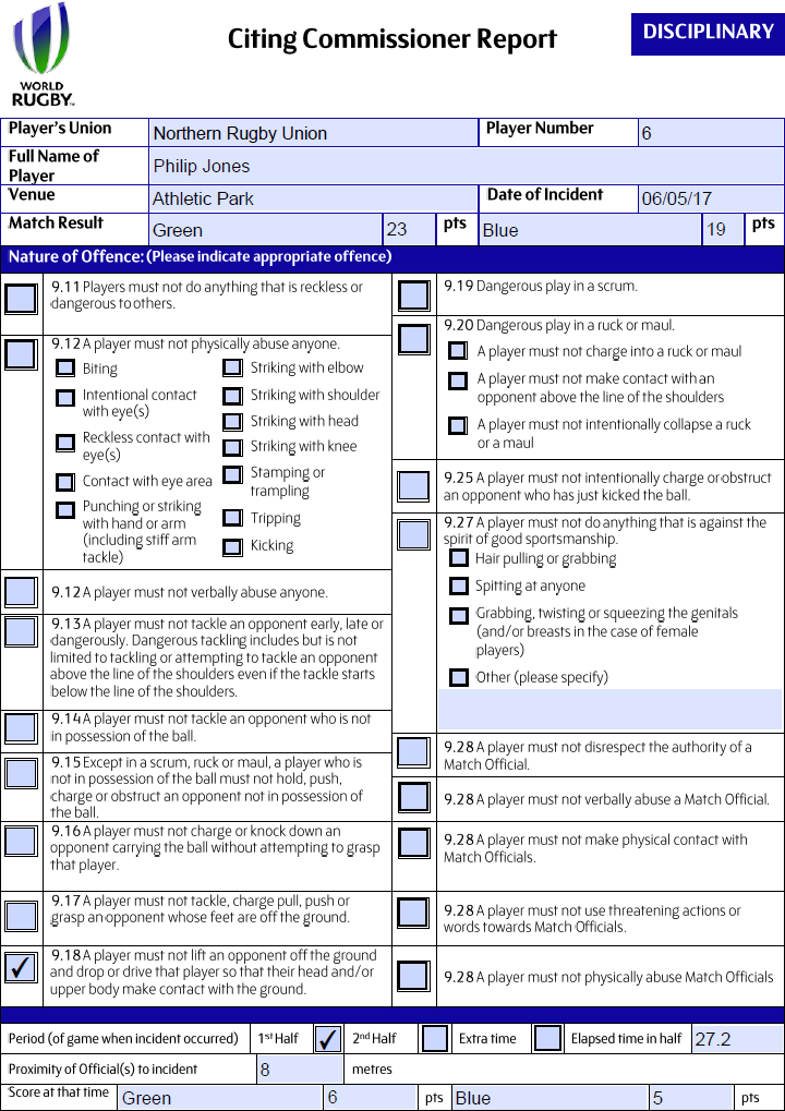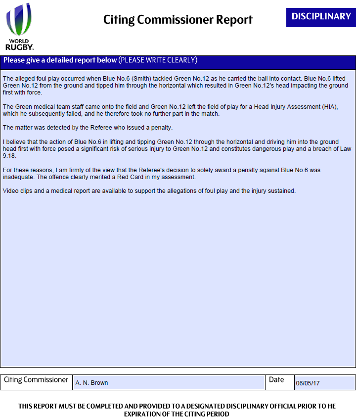 Set out what your conclusions are regarding the alleged act of foul play As a result, I consider the penalty awarded by the Referee was insufficient and that Blue No.6 should be cited for a dangerous lifting tackle, contrary to Law 9.18.