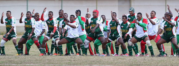 The Madagascar team perform their Haka before a Rugby World Cup 2015 qualifying match against Namibia