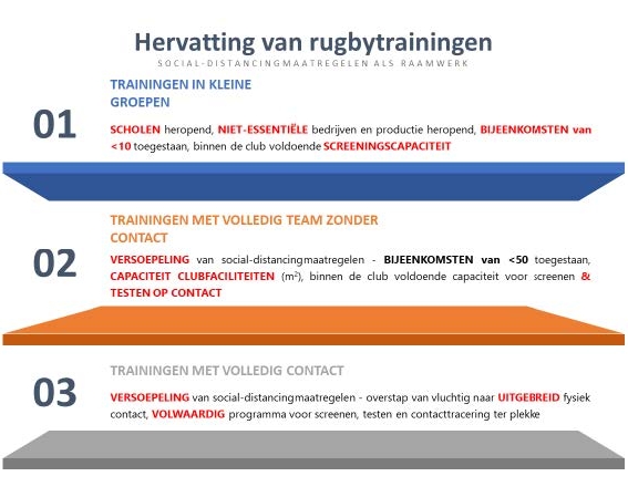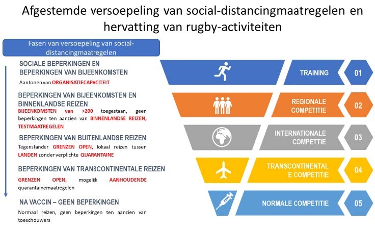 Afbeelding 2 kan dienen als leidraad vanaf het moment dat trainingen worden hervat tot de hervatting van alle rugbycompetities en -toernooien, waaronder internationale wedstrijden met toeschouwers.