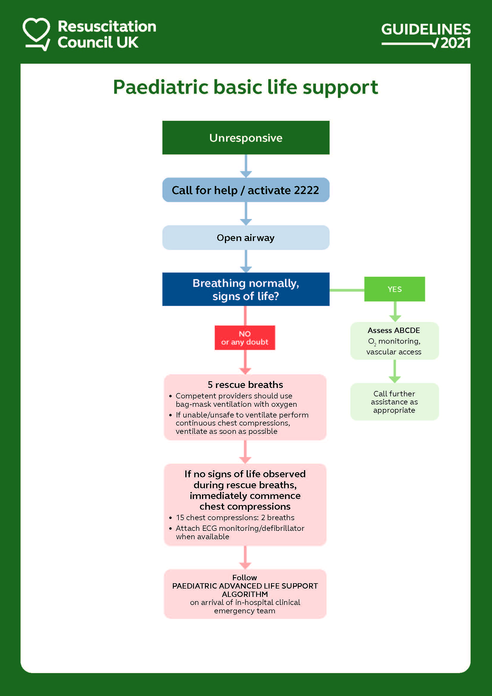 The paediatric life support algorithm is similar to that of the adult algorithm. The main differences are; on identifying the paediatric patient is not breathing 5 rescue breaths/ventilations should be delivered before checking for further signs of life e.g. a pulse. If after the 5 rescue breaths/ventilations have been delivered and there are no sign of life, then 15 chest compressions should be administered.