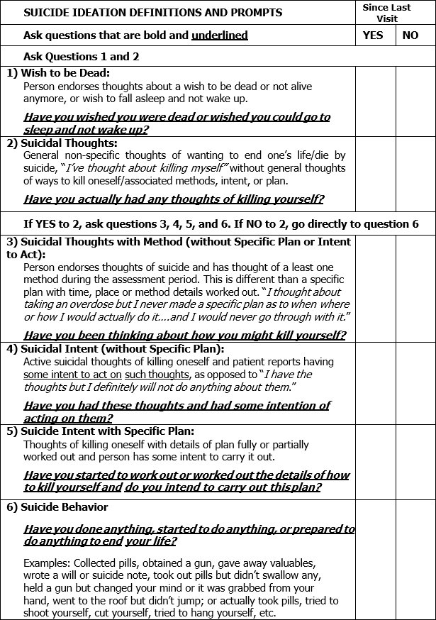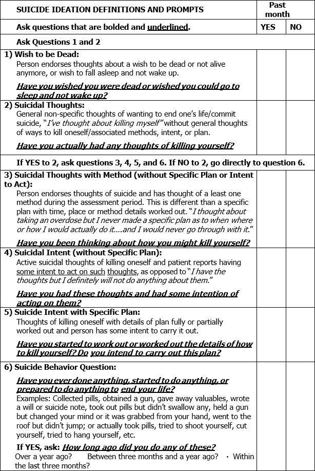 Interpretation: If someone answers “yes” to the questions about plan/intent and past attempt especially within the last year, they are considered high risk and usually require a more comprehensive assessment.