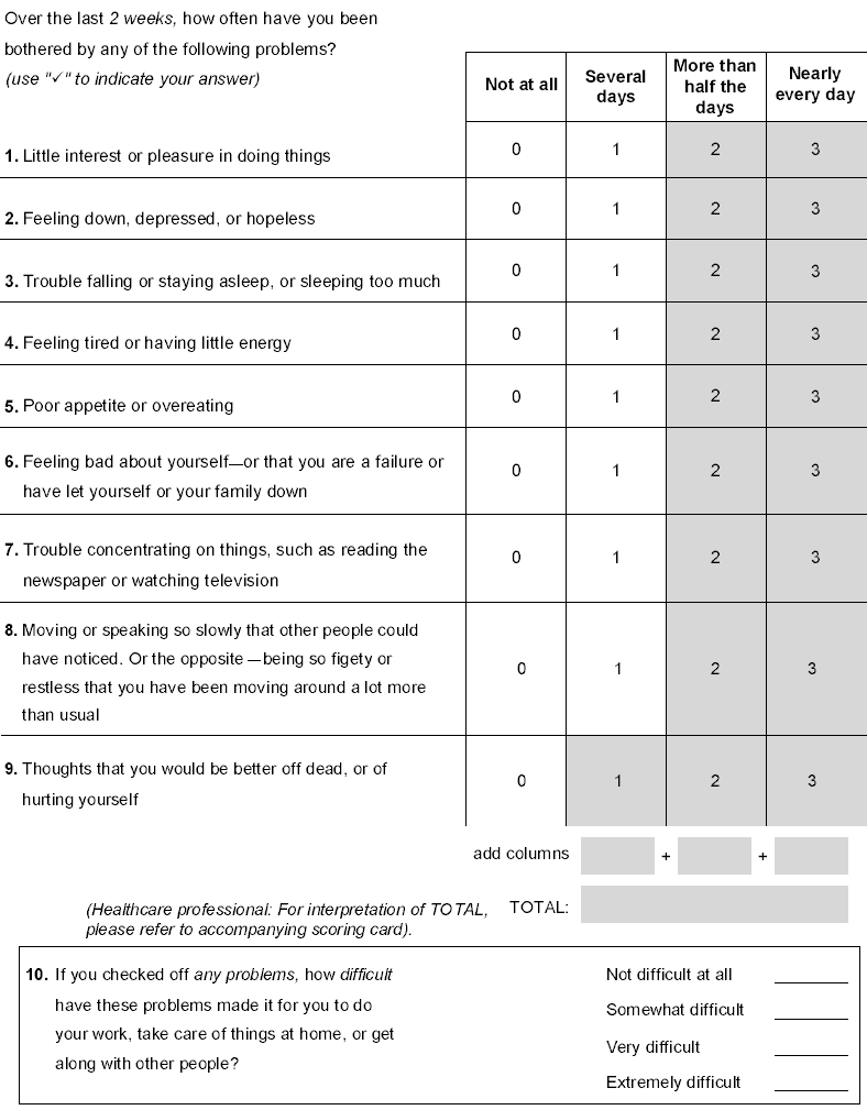 Depression can be screened for with the help of the Patient Health Questionnaire (PHQ-9). https://www.integration.samhsa.gov/images/res/PHQ%20-%20Questions.pdf Patient Health Questionnaire (PHQ-9)