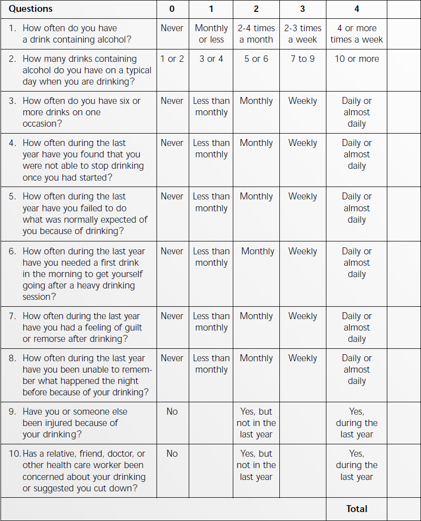 Because alcohol use can affect your health and can interfere with certain medications and treatments, it is important that we ask some questions about your use of alcohol. Your answers will remain confidential so please be honest. Place an X in one box that best describes your answer to each question.
