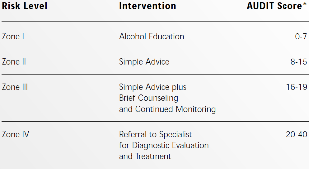 Total scores of 8 or more are recommended as indicators of hazardous and harmful alcohol use.
