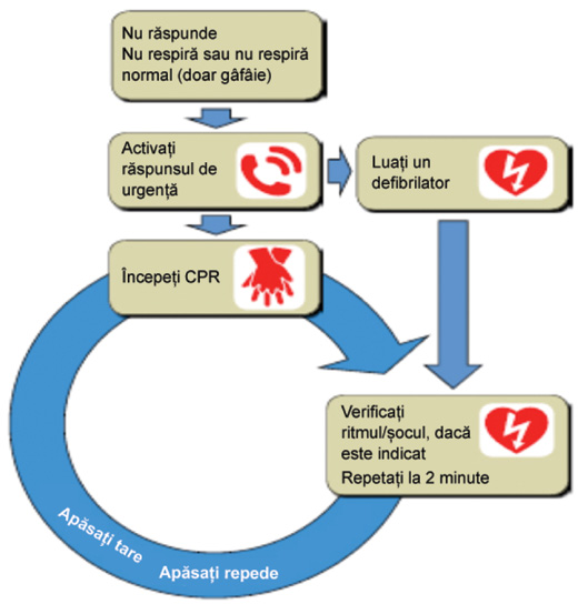 Schema de resuscitare pentru utilizarea AED (prin amabilitatea American Heart Association)
