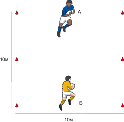 Команда А нападает на команду Б. Когда до игрока дотрагиваются, он должен положить мяч между ног, и его товарищ по команде должен передать мяч для того, чтобы снова начать нападение. Игрок, который выполнил касание, должен обежать вокруг конуса или мешка для захвата до возвращения в игру.