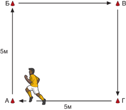 Существуют два варианта этого упражнения. В первом варианте игроки бегут к первому конусу, где они должны затем передать пас, продолжить движение к следующему конусу и выполнить возвратный пас. Когда они добегут до последнего конуса, они выполнят спринт к старту. Упражнение выполняется на время, и игрокам следует сфокусироваться на передаче хорошего паса. Расстояние между конусами - 10 м.