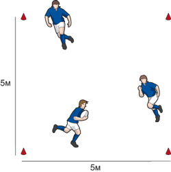В группе из трех или четырех человек, игроки передают мяч друг другу пасом и после каждого паса они должны дотронуться до конусов 1, 2 или 3 (по выбору тренера) и снова присоединиться к игре.