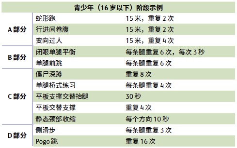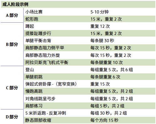 该计划的青少年和成人版本通常包括以下练习:跑步和变向类练习、下肢平衡练习、增强式练习和落地练习,以及自重练习和搭档阻力练习。以下 是青少年(16 岁以下)和成人版 Activate 计划某一阶段的练习示例: