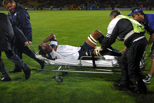应将腿部疑似骨折的运动员抬离赛场